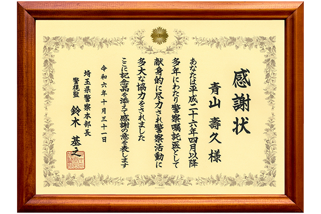 【さやま地域ケアクリニック】 警察嘱託医感謝状を授与:さやま地域ケアクリニック 青山壽久 院長